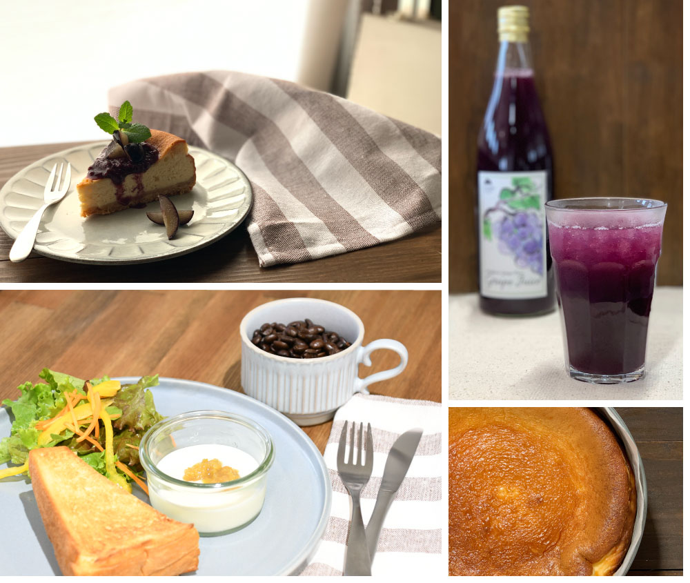 土作りからこだわり、一房一房に愛情を込めて育てた完熟ぶどうを贅沢に使用し、ぶどう本来の甘みを活かしたメニューをお届けします。